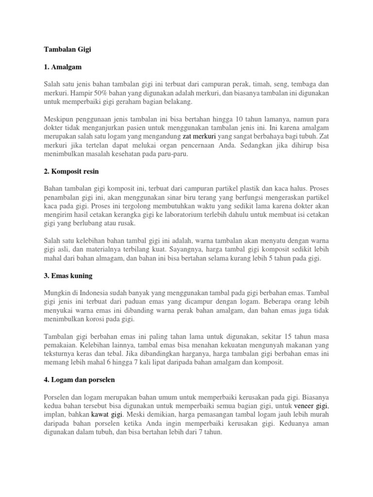 4 Jenis Tambalan Gigi Dan Prosedur Pemasangannya Di Dokter Gigi from storage.googleapis.com Pemilihan bahan tambalan gigi ini biasanya disesuaikan dengan letak gigi, tingkat kerusakan pada gigi, dan biaya bahan pengisinya. Ini semua yang perlu anda ketahui tentang tambalan dari para ahli di. Namun hampir 50% bahan yang digunakan adalah merkuri dan biasanya tambalan ini digunakan untuk memperbaiki gigi geraham bagian belakang. Ada beberapa jenis tambalan yaitu : Banyak struktur gigi yang harus diambil untuk memberi tempat bagi restorasi jenis ini. Merkuri yang berada dalam amalgam tidak beracun karena telah dikombinasikan dengan beberapa. Setelah ditambal bagus gigi depannya,ibu ini bisa tersenyum lepas|tambalan gigi depan (juli 2021). Sayangnya, hanya 24 persen masyarakat yang mengetahui soal kandungan merkuri pada tambal gigi amalgam.
